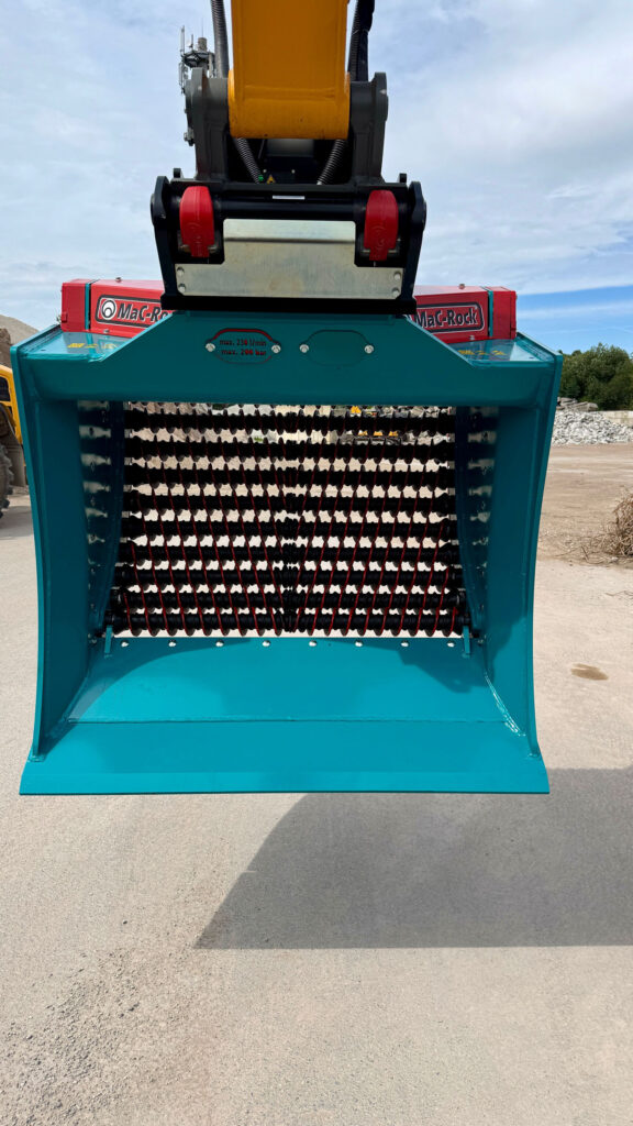 Der Baggerlöffel ist sehr wartungsarm und seine Form optimiert das Füllverhalten beim Graben und Siebleistung. Es kann bereits beim Graben / Füllen mit dem Sieben begonnen werden und durch den kreisförmigen Gutfluss im Löffelinneren, ist ein reibungsloser Materialfuss beim Siebprozess garantiert.